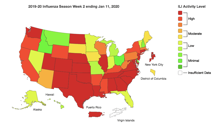 There have been stories all over the news recently about freak deaths of healthy children and teens who were unvaccinated against the flu: including heart wrenching tales of a young girl in Dallas, and a 16 year-old girl from Ohio. Based on estimates from the CDC, so far this season there have been at least 13 million flu illnesses, 120,000 hospitalizations and 6,600 deaths from flu. The CDC’s map of influenza-like-illness (ILI), below, shows that the flu is widespread across almost the entire US from October – now, and the Southern part of the country has especially high activity.