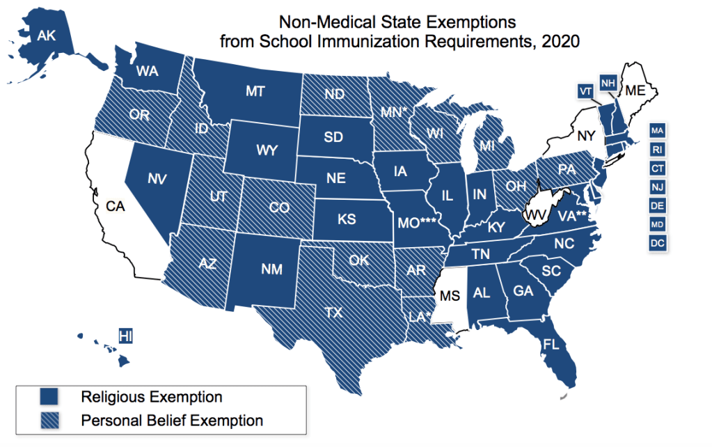As of January 2021, all but 5 states (CA, ME, MS, NY, WV) offer NMEs for religious reasons, philosophical reasons, or both. Two of these states, New York and Maine, only just removed NMEs in 2019 after widespread measles outbreaks that year.